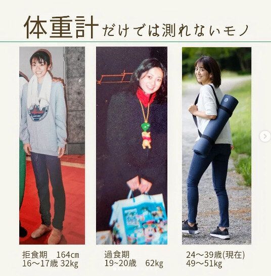 過去に過食や拒食を経験したというnagi_sasayogaさん。いちばん右側が現在のお写真です。引き締まった健康的なボディがとっても素敵ですね。24歳から39歳の現在までほとんど体重も変わっていないということも驚きです!