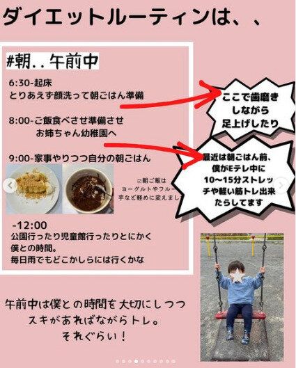 こちらがkan_diet153さんの午前中のルーティン。子どもとの時間を大切にしながらも、すき間時間をみつけて、少しの時間でも体を動かしていることがよくわかります。歯を磨きながらちょっとした足上げ運動、子どもがEテレを見ているあいだに、筋トレやストレッチ。ちなみに、朝ごはんはヨーグルトやフルーツなど手軽に食べられるものに変えたそう。
