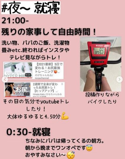 子どもたちを寝かしつけて家事をすませたあとは、待望の自由時間です!SNSの投稿をつくりながらバイクをしたり、その日の気分で動画を見ながらトレーニングをしたり。