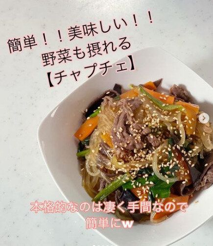 生理のときはトレーニングはお休みというi.k.dietさん。「週末は心の休憩、生理のときは体の休憩」なのだそうですよ。そんなときは、手軽につくることができるヘルシーレシピがおすすめ。こちらは、野菜もたっぷりの「チャプチェ」です。