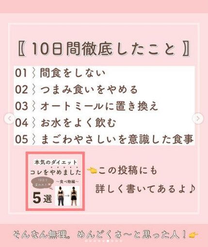 まずは10日間、食生活の改善にチャレンジしました。「間食をしない」「つまみ食いをやめる」「オートミールに置き換え」「お水をよく飲む」「ま(豆類)ご(ごま)わ(海藻類)や(野菜類)さ(魚)し(キノコ類)い(イモ類)を意識した食事」。これを10日間徹底したところ…