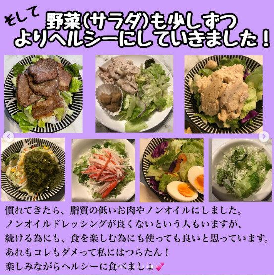 「サラダを摂る」ということに少しずつ慣れてきたら、次のステップへ。脂質の低いお肉や、ノンオイルドレッシングなど、徐々にヘルシーな食事に変えていきました。今では、写真のとおり、バラエティにとんだサラダプレートに。これなら毎日、飽きずに続けていくことができますね。