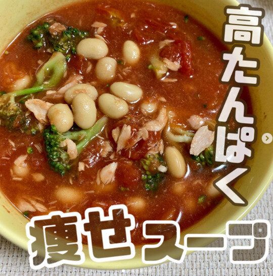 こちらはその名も「やせスープ」。つくり方も簡単です。トマト缶1/2を耐熱皿に入れ、水100mlを入れます。コンソメ顆粒小さじ2弱を入れて、ノンオイルツナ1缶、蒸し大豆1/2袋、ブロッコリー適量を入れて混ぜます。ふんわりとラップをして電子レンジ(600W)で約5分加熱し、軽く混ぜたらできあがり!これひとつで、たんぱく質が手軽にとれるのでいそがしいときなどにもってこいそうですよ。