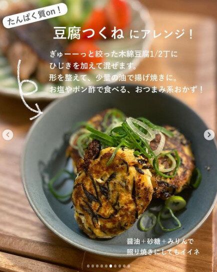 こちらはさきほどの「基本のひじき煮」のアレンジ編です。水切りした木綿豆腐1/2丁にひじき煮を加えて混ぜます。形を整えて、少量の油で揚げ焼きに。お塩やポン酢でいただきます。しょう油、さとう、みりんで照り焼きにするのもおすすめ。