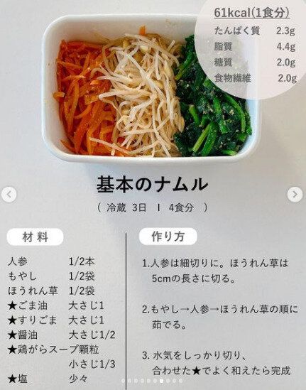 こちらもbeniokitchenさんがよくつくる常備菜、「基本のナムル」です。もやし、人参、ほうれん草の順に茹でます。水気をしっかり切り、ごま油、すりごまを各大さじ1、醤油大さじ1/2、鶏がらスープ顆粒タイプを小さじ1/3、塩少々でよくあえたら完成です。ダイエット中のメニューの彩りにもなってくれるうれしいレシピですね。