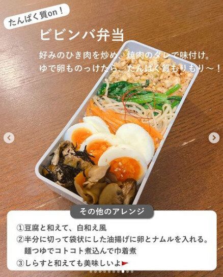 こちらはさきほどの「基本のナムル」のアレンジ編。好みのひき肉をいため、焼き肉のたれで味つけ。ゆで卵ものせて、タンパク質はバッチリです。ナムルで野菜もしっかり、お弁当も華やかに!