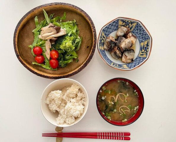 食べることを大切にしているamieplaisir2014さん。こちらがある日のお昼ごはんです。野菜たっぷり、お味噌汁に魚、ごはんと、滋味あふれる豊かな食事です。お味噌汁は定番のメニュー。胃腸を温めてくれる、冷えにも効果的、便秘改善にも効果大、満腹中枢も刺激されてごはんの食べすぎも防げる、などメリットばかりなのだそう。
