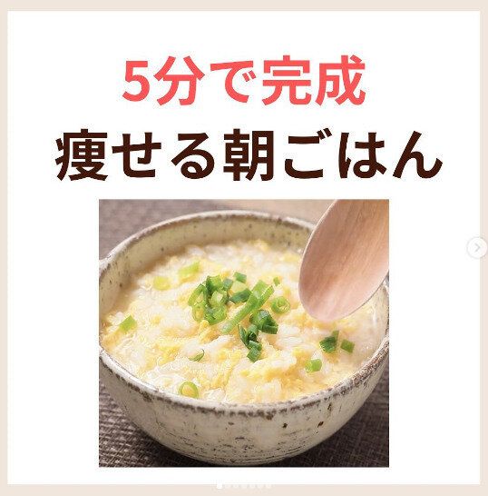 朝食をとらないと体が省エネモードになり、基礎代謝が落ちることでやせにくい体になってくるのだそう。でも働くお母さんたちの朝はいそがしい!そこで時短朝食メニューをご紹介しましょう。こちらは「たまご雑炊」です。作り方は、耐熱容器にごはん120gと水200ml、顆粒和風だし小さじ1、しょう油小さじ1、塩ひとつまみを入れて混ぜ、溶き卵1個をまわしいれます。ラップをふんわりとして600Wの電子レンジで3分程度。ご飯が柔らかくなったら、小ネギを散らして完成です。朝からお腹も心もあったまる1品。たったの5分で完成です。