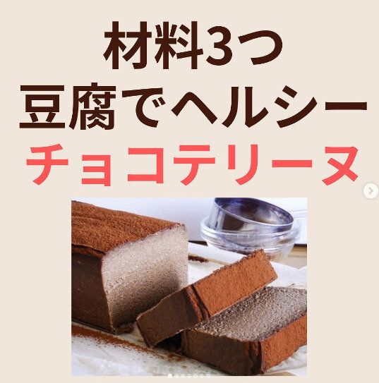 最後はデザートもご紹介。豆腐でつくる「チョコテリーヌ」です。材料もシンプルで簡単。きめのこまかいこし器で、水気を切った絹ごし豆腐300gをこし、卵2個を入れてよく混ぜます。チョコレート200gをこまかく割り、600Wの電子レンジで1分加熱してよく混ぜます。豆腐の生地に溶かしたチョコレートを入れてよく混ぜて型に流し入れます。170度に予熱しておいたオーブンで30~40分焼き、粗熱をとったら冷蔵庫で3時間冷やしてできあがり。豆腐の水気をしっかりと切っておくのがおいしくつくるポイントだそう。これならダイエット中でも罪悪感なく食べることができますね。もちろん、食べる分だけお皿にとって食べすぎは禁物です!