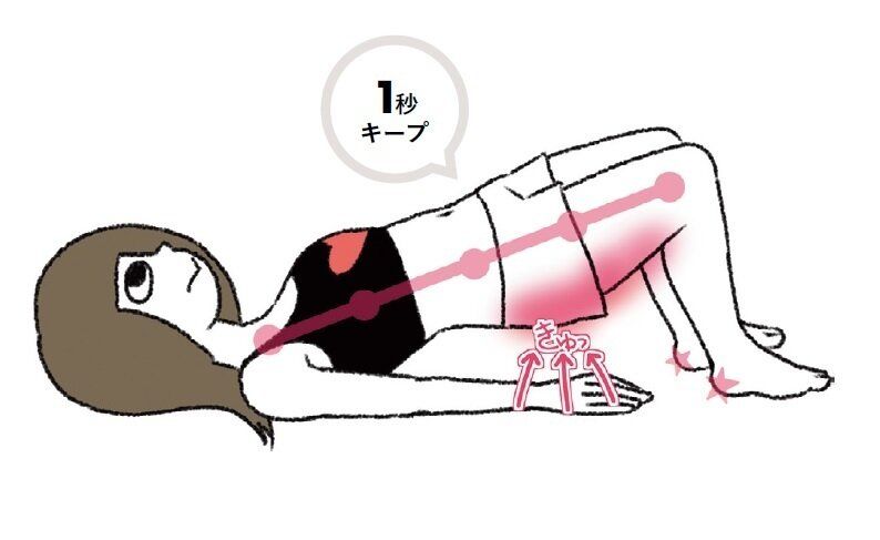 あおむけで両ひざを立て、足は腰幅に。おしりに力を入れて持ち上げ1秒キープ。腰は反らず、背中を真っすぐに。