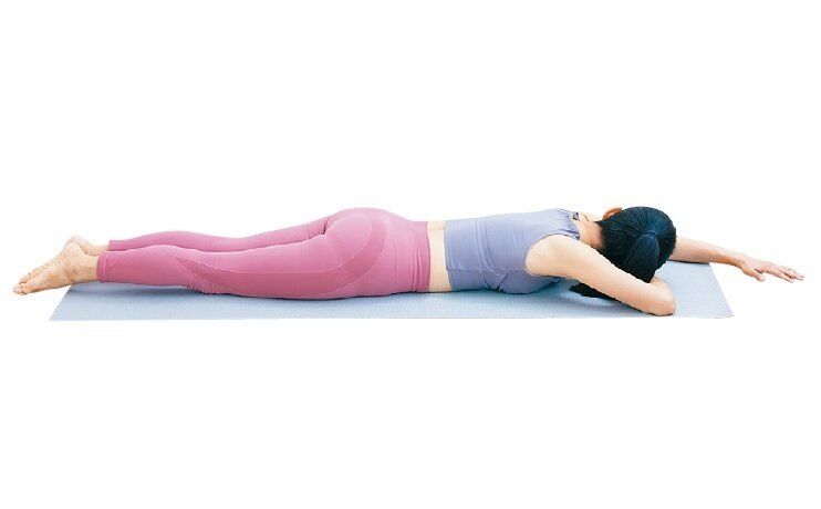 うつぶせで両足をそろえて伸ばし、右手は顔の下に。左手は上に伸ばし、顔は左に向けて。
