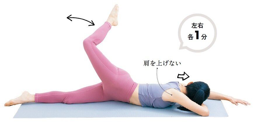 右足を高く上げ、左側に伸ばします。足だけでなく腰ごと浮かせて。息を吐いてひざを曲げ、吸って伸ばします。これを繰り返したら、反対側も同様に。