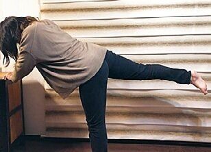 壁に手をつけて片足を上げることで、両方の脚の筋肉を刺激。太もものたるみが解消!