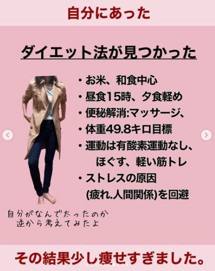 和食中心の食生活、昼食は15時ごろにとって夕食は軽めに、マッサージや軽い筋トレ、ストレスをためないなど。自分がなぜ太るのかという原因をしっかりと見つめたからこそ、ダイエット方法が明確になっていったのです。
