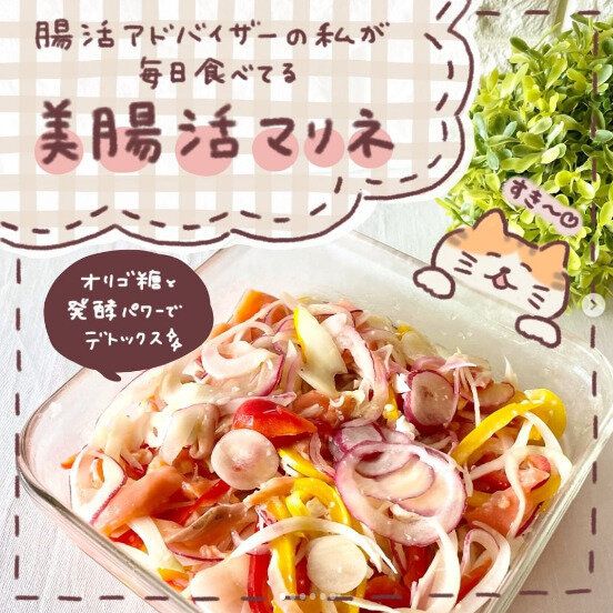 腸活食材をたっぷり使った「すっきり腸活マリネ」。smile_mom_tさんも毎日食べるほどおいしいレシピだそう。材料は、玉ねぎ、赤玉ねぎ、パプリカ、スモークサーモン、クリームチーズです。マリネ液は、オリーブオイル大さじ3、白ワインビネガー大さじ2、はちみつ大さじ1。そして酸っぱさを抑える塩こうじ小さじ2を入れるのもポイント。マリネ液につけて、冷蔵庫で半日以上つければヘルシーレシピのできあがり!善玉菌の大好物、「食物繊維」「発酵食品」「オリゴ糖」が無理なくとれるそうです。