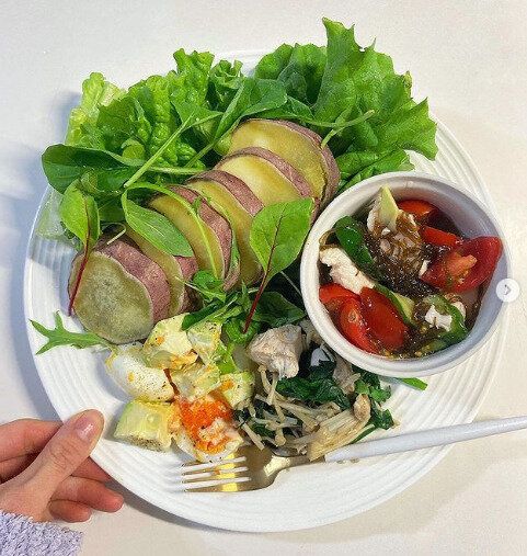salad_164an_さんの朝食は、ワンプレートに盛りつけたサラダが定番。今朝の朝食は、グリーンリーフ、ベビーリーフがモリモリ。きゅうり、ミニトマト、ささみをもずくであえたもの、アボカド、たまごのマヨネーズあえ、ほうれん草、えのき、ささみを塩コショウであえたもの、そしてたっぷりのさつまいもです。「P(たんぱく質)F(脂質)C(炭水化物)バランス」はもちろん、腸の働きを整える「腸活」にもなるメニューです。