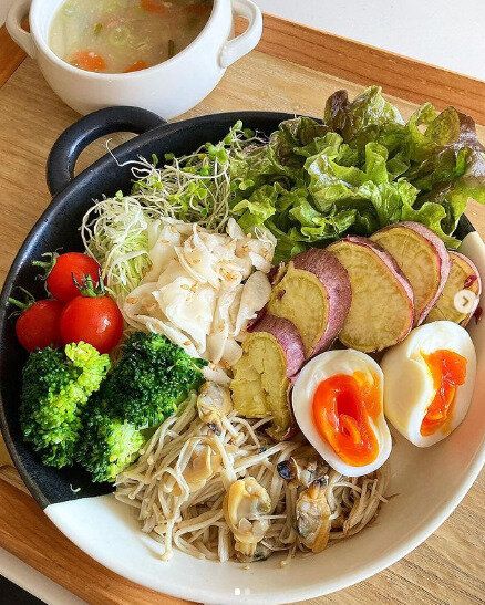 今朝のメニューは、ボリュームたっぷりのサラダプレートにお味噌汁をつけて。材料は、キャベツ、ブロッコリースプラウト、グリーンリーフ、ミニトマト、ブロッコリー、大根の酢漬け、えのき、あさり、ゆで卵、さつまいも、人参、玉ねぎ、ねぎ。きのこや酢漬けは「腸活」にもってこいの食材。温かいお味噌汁をつけることで栄養バランスが整うだけでなく、体もホッとできそうですね。