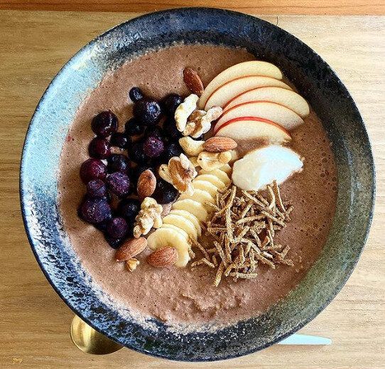 ときにはこんな朝食のときも。オールブランブランリッチ、プロテイン、ブラックコーヒー、バナナ、りんご、ブルーベリー、ナッツ、ヨーグルトです。プロテインと果物をスムージーにしてオールブランにかけるのだそう。体が冷えてしまう食材なので、温かい飲み物といっしょにいただきます。
