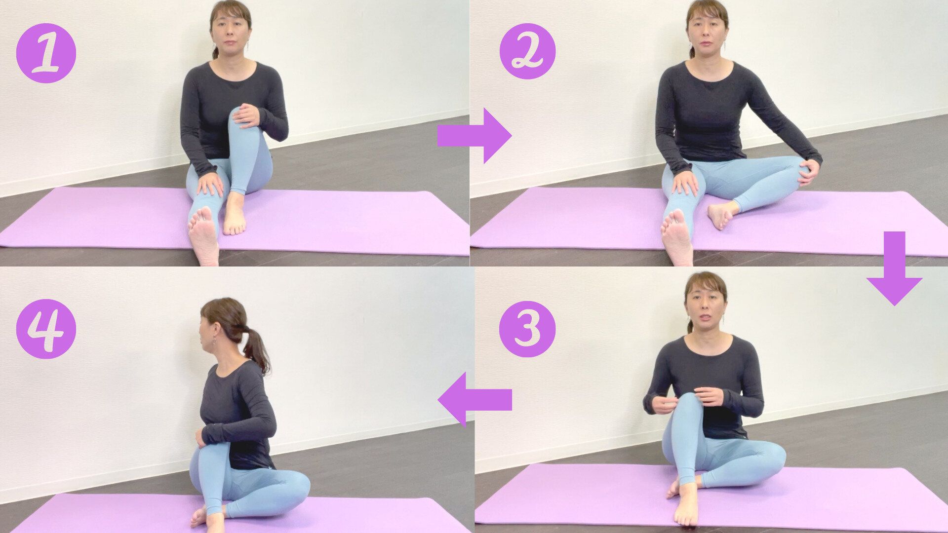(3) 右ひざを立てて、左の足首を右ひざの下にくぐらせましょう。
