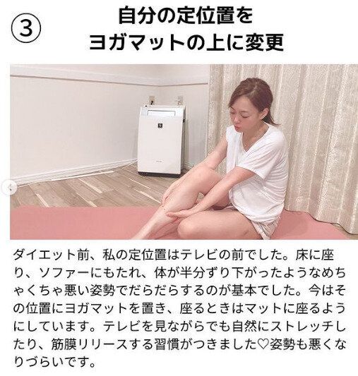 ダイエット前のkiki_diet_trainingさんの定位置はテレビの前。ソファにもたれ、体がずり下がった状態の姿勢で過ごしていたそう。(思い当たる節がある人も多いはず…)。今は、そこにヨガマットを敷き、テレビを見ながらストレッチしたり、筋膜リリースをしたり。体のメンテナンスは場所や時間を決めて気合でやるものではなく、すき間時間をみつけて習慣化することが大切なんですね。