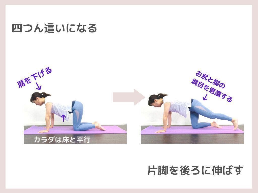 太ももの裏側を鍛えることで、美尻に近づくでしょう。やり方は簡単で、四つん這いになって片足を後ろに伸ばしたり、ひざを胸に近づけたりするだけです。