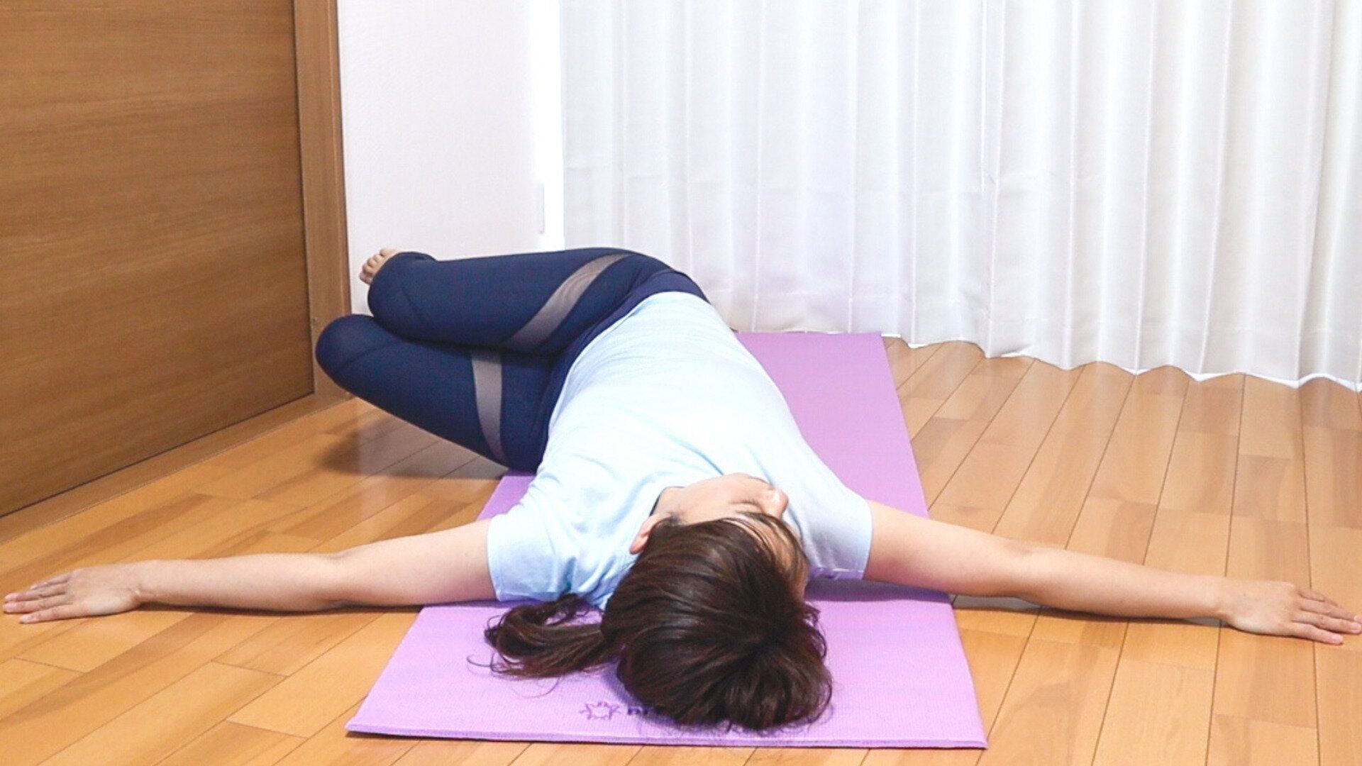 上向きの犬のポーズをすることで、お腹の筋肉を伸ばすことができます。寝たままで気持ちよくお腹を伸ばすことができるので、お風呂上がりなどにぜひ行ってみてください。
