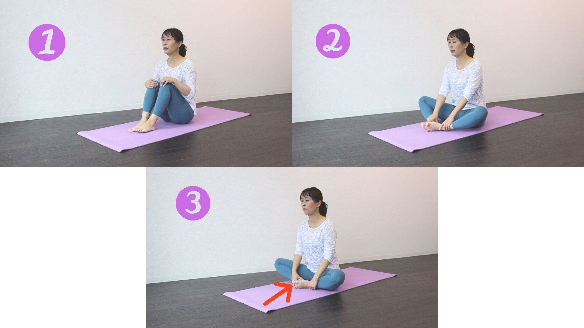 (2) 両ひざを外側にパタンと倒し足裏を合わせす。