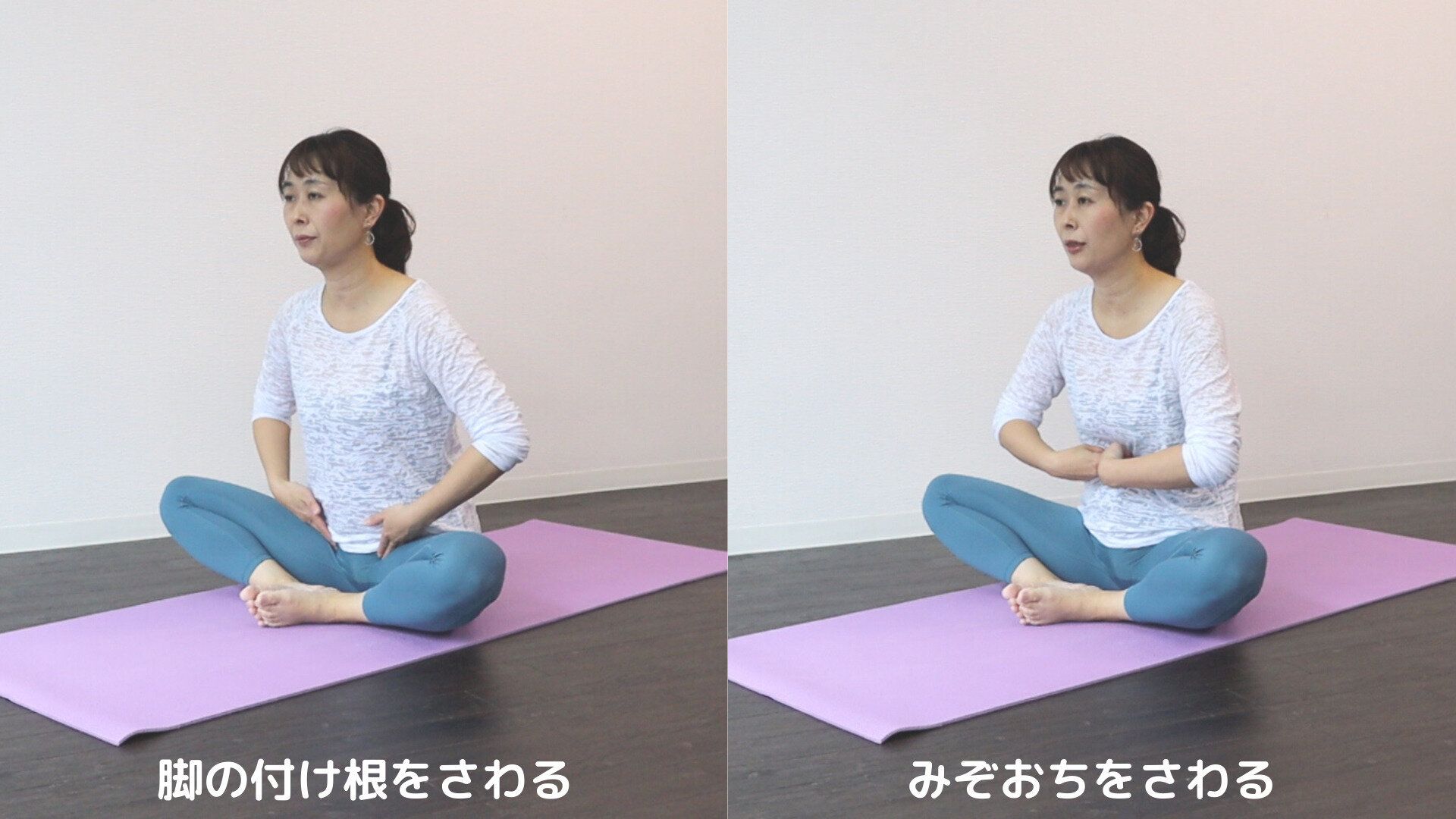 脚の付け根とみぞおちをさわっておくと、無駄な力が抜けてポーズがやりやすくなります。