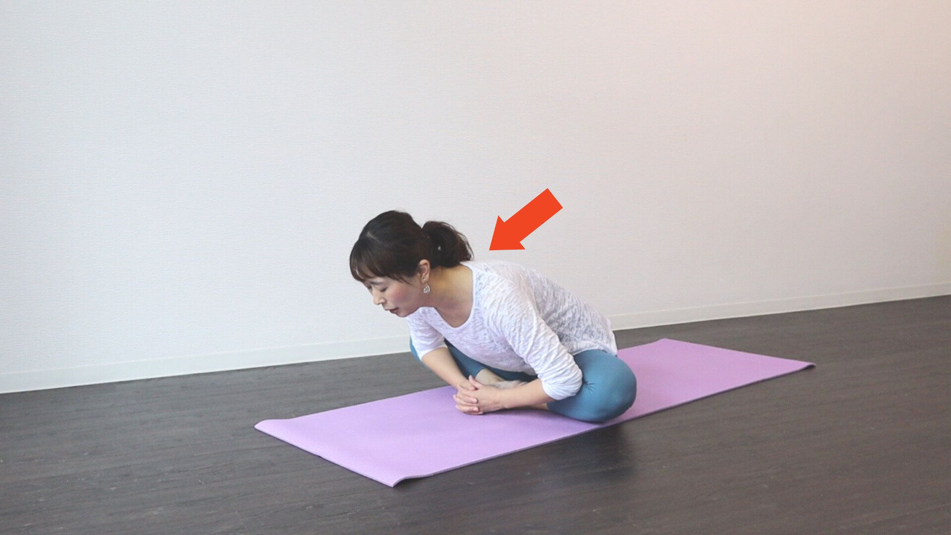 (2) 吐く息で脚の付け根からゆっくり上半身を前に倒していきましょう。
