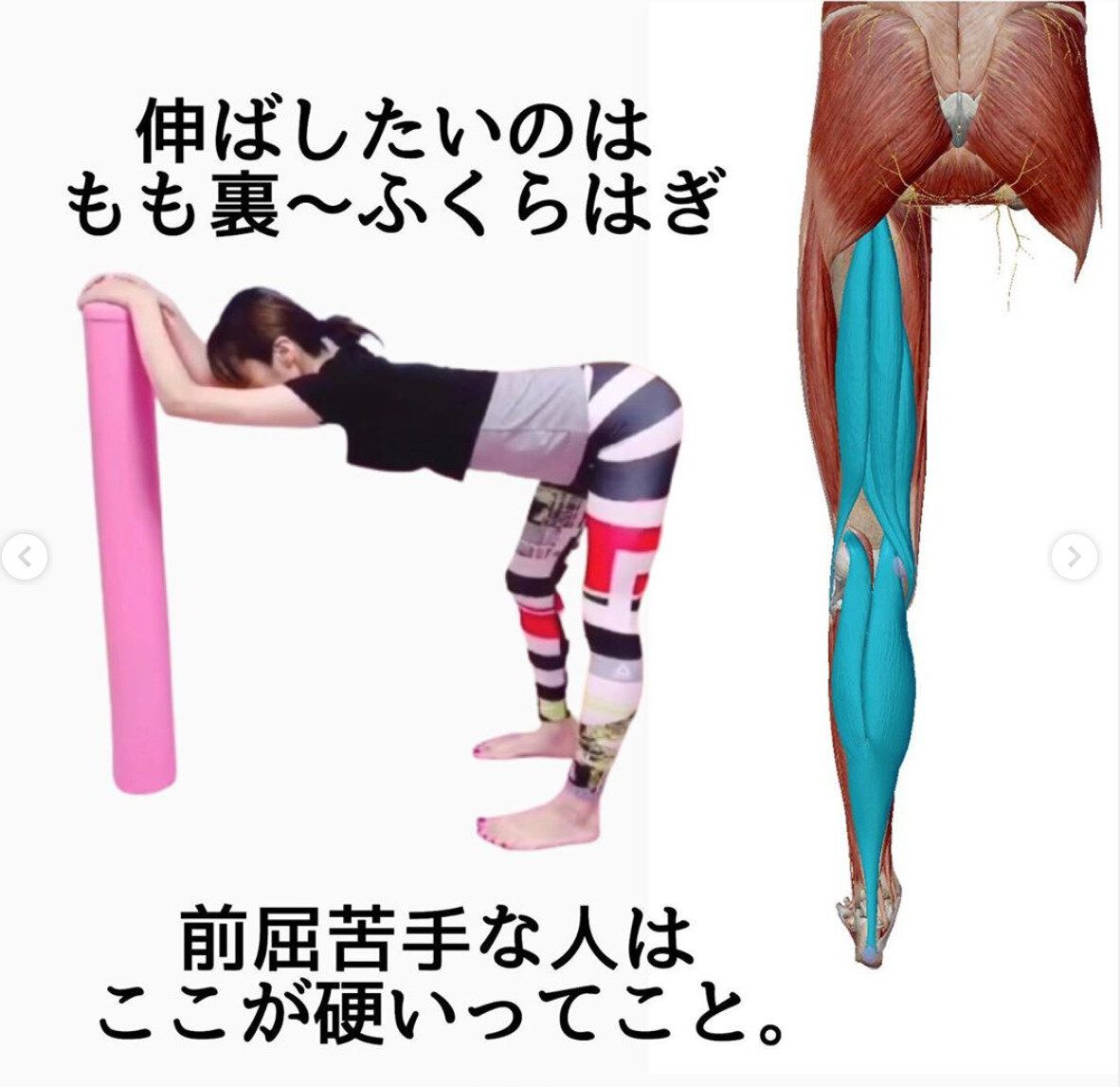 前屈をがんばったときにひざ裏がピーン!と痛くなったことはありませんか?もも裏の筋肉や、ふくらはぎの筋肉は膝の裏まで続いています。ここが伸ばされるからピーン!と痛みを感じるんですね。