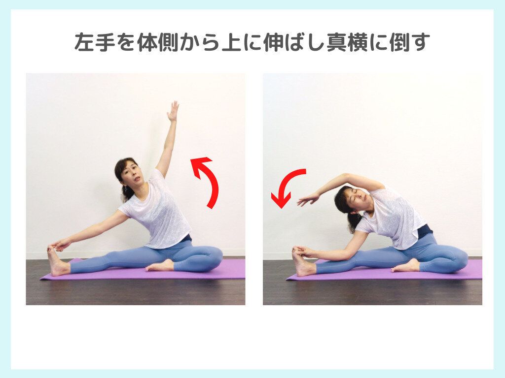 (6) 左手をゆっくり持ち上げながら、カラダを右側に倒します。