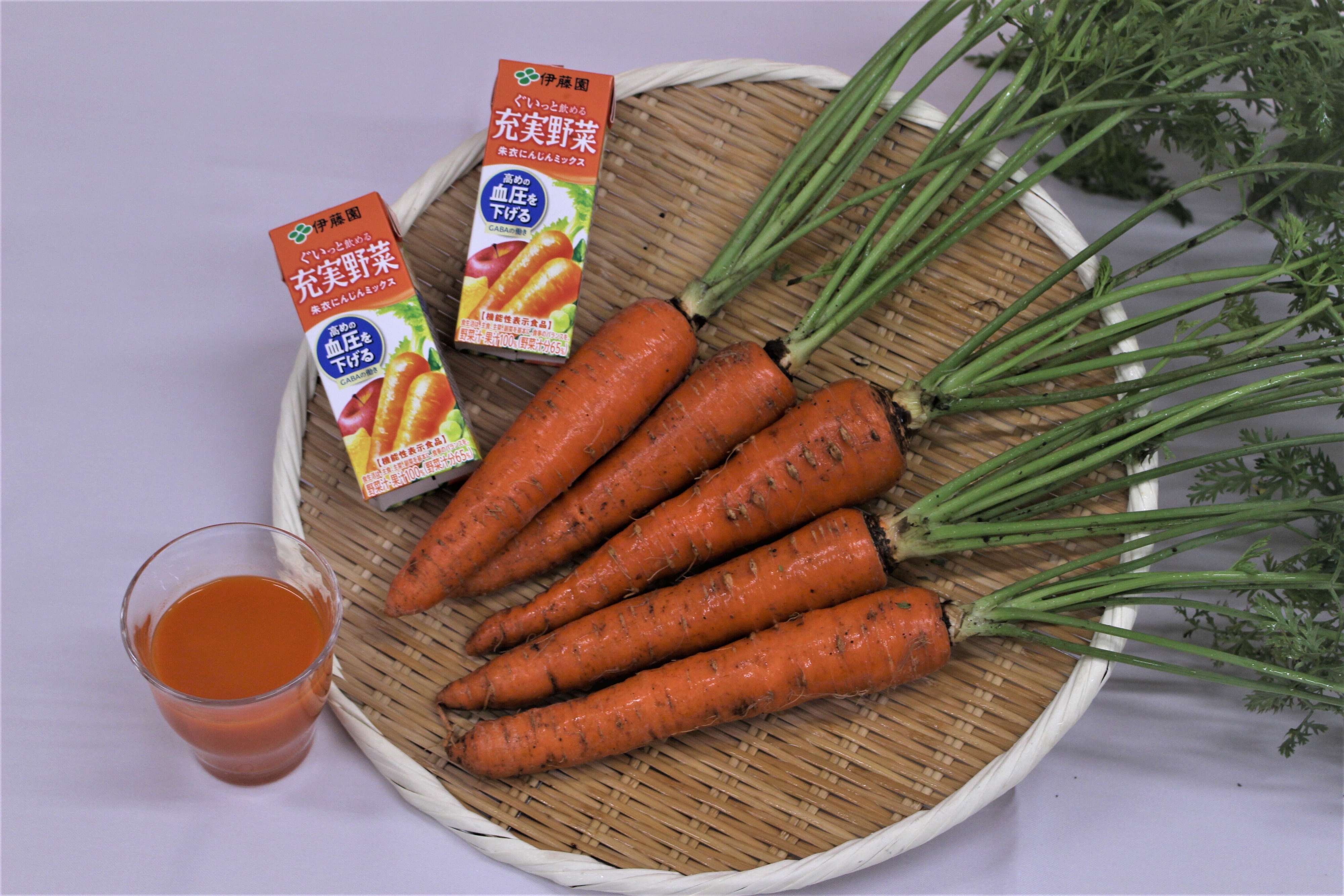 伊藤園の「充実野菜 朱衣にんじんミックス」に使われているにんじん「朱衣」は、なんと国内外50以上の品種から、約10年かけて選びぬかれたという逸材。その理由としては、甘みが強く、一般的なにんじんの1.1〜1.3倍の糖度であると同時に、にんじん特有の青臭みが軽減されているそうです。さらに、にんじんといえば緑黄色野菜に多く含まれるカロテノイドの一種、βカロテンですが、こちらも一般的なにんじんの約1.5倍含有しています。