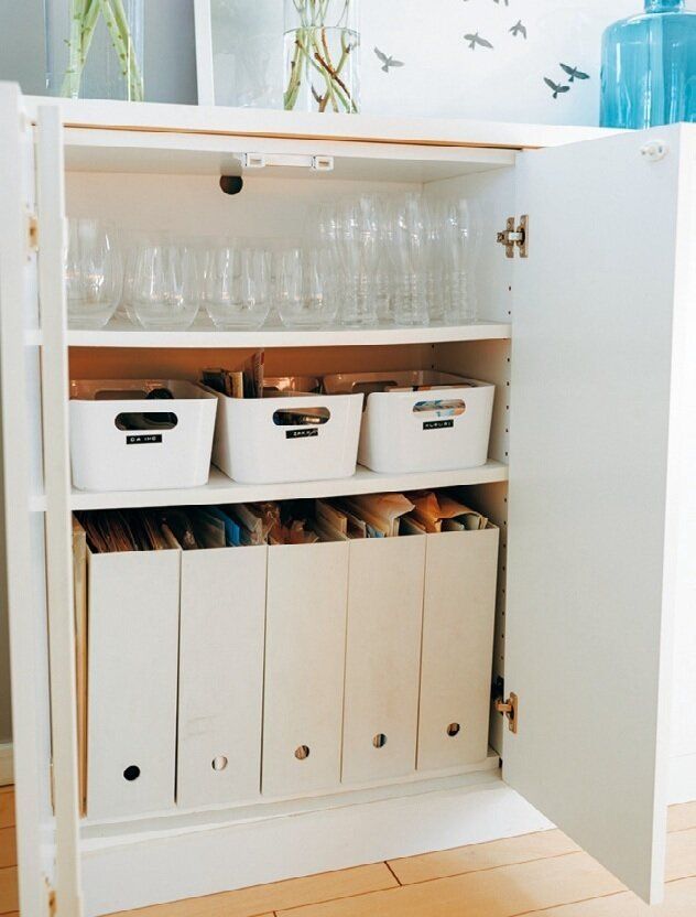 キャビネットには、客用のグラス、取説などの書類を保管。薬類や電池などは半年ごとに見直しして、たりない物を補充し、古い物を処分していざというときに備えています。