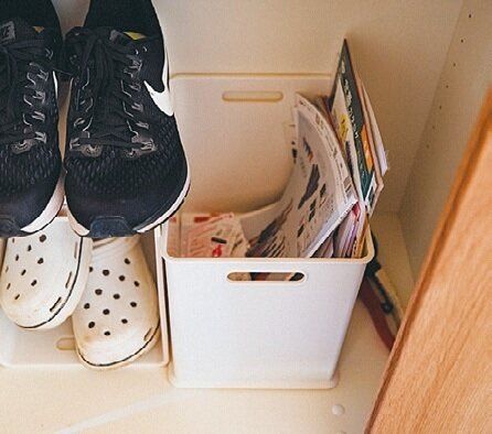 郵便物は帰宅時に玄関先でチェック。不要なDMやチラシは靴箱の中に置いたゴミ箱にすぐ捨て、部屋に持ち込まないルールに。資源ゴミとして出すときも動線がスムーズ。