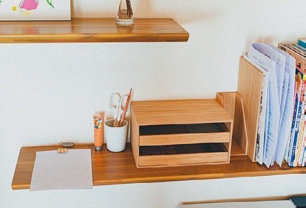 たまりがちな子どものプリント類は、重要な物だけスマホで撮影して保存したら、はさみでカットしてメモ紙として再利用。はさみも近くにスタンバイしています。