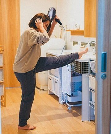 A 洗面台横に収納しているドライヤーで髪を乾かしながら、脚の裏側をストレッチ