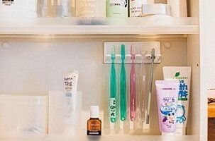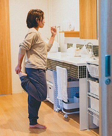 B 前ももを交互に伸ばしながら歯みがき。歯ブラシは鏡裏のキャビネットに空中収納