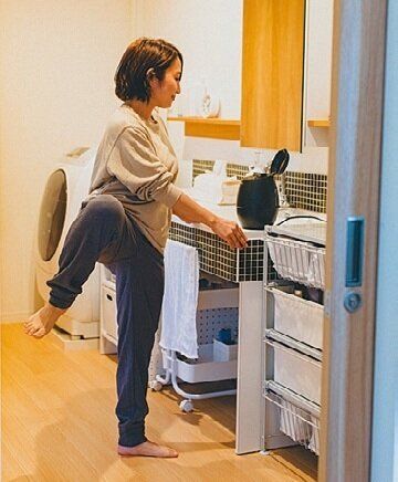 C 洗面台下のワゴンが定位置の美容スチーマーを使う間、左右交互に股関節を回してほぐす
