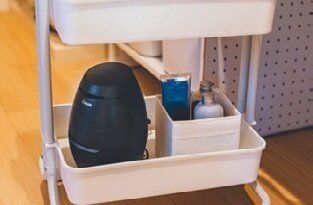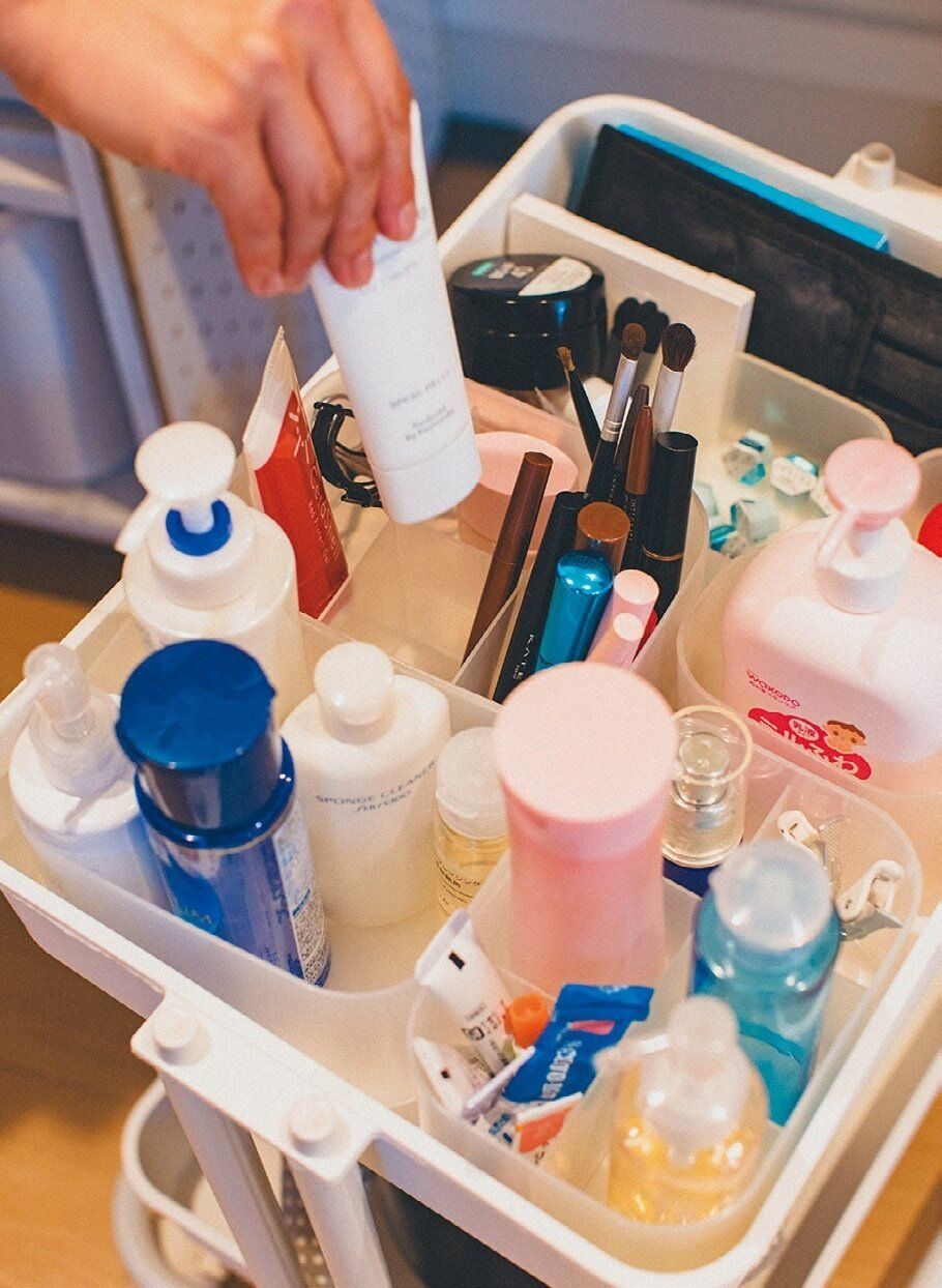 ワゴンの上段に仕切りケースを置き、美容グッズを立てて分類収納。指定席が明確だからノールックで取って戻すことができます。仕切りがストッパーとなり、ワゴンを動かしたときボトルが倒れないのもポイント。