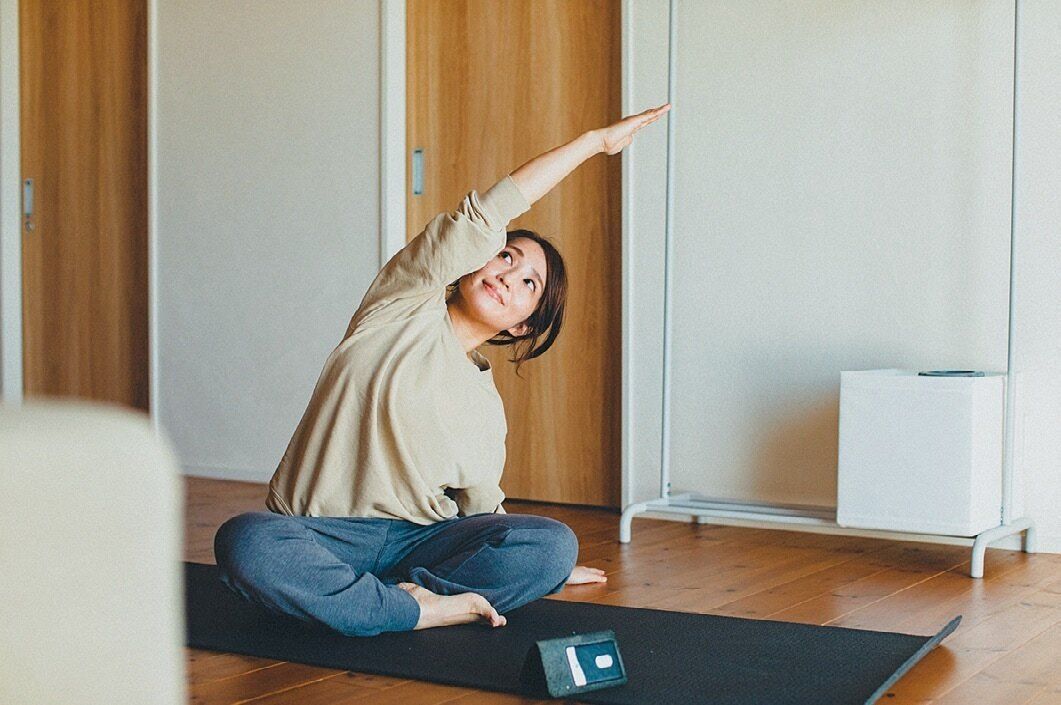 寝る前にリビングにヨガマットを敷き、YouTubeのエクササイズ動画を見ながら20分ほどストレッチ。「ゆるめの内容でリラックスしながらでき、寝つきもよくなりました!」。