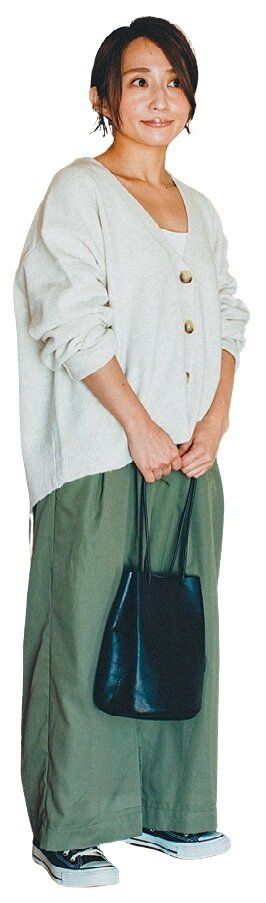 B ユニクロのカーディガンはあえてのXLサイズでゆったり着こなし、首もとや手首を見せて抜け感を出す