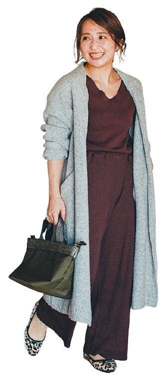 C トップスとボトムスをブラウンで統一し、ロングカーディガンをはおって縦のラインを強調。足の甲を見せてスッキリ感もプラス