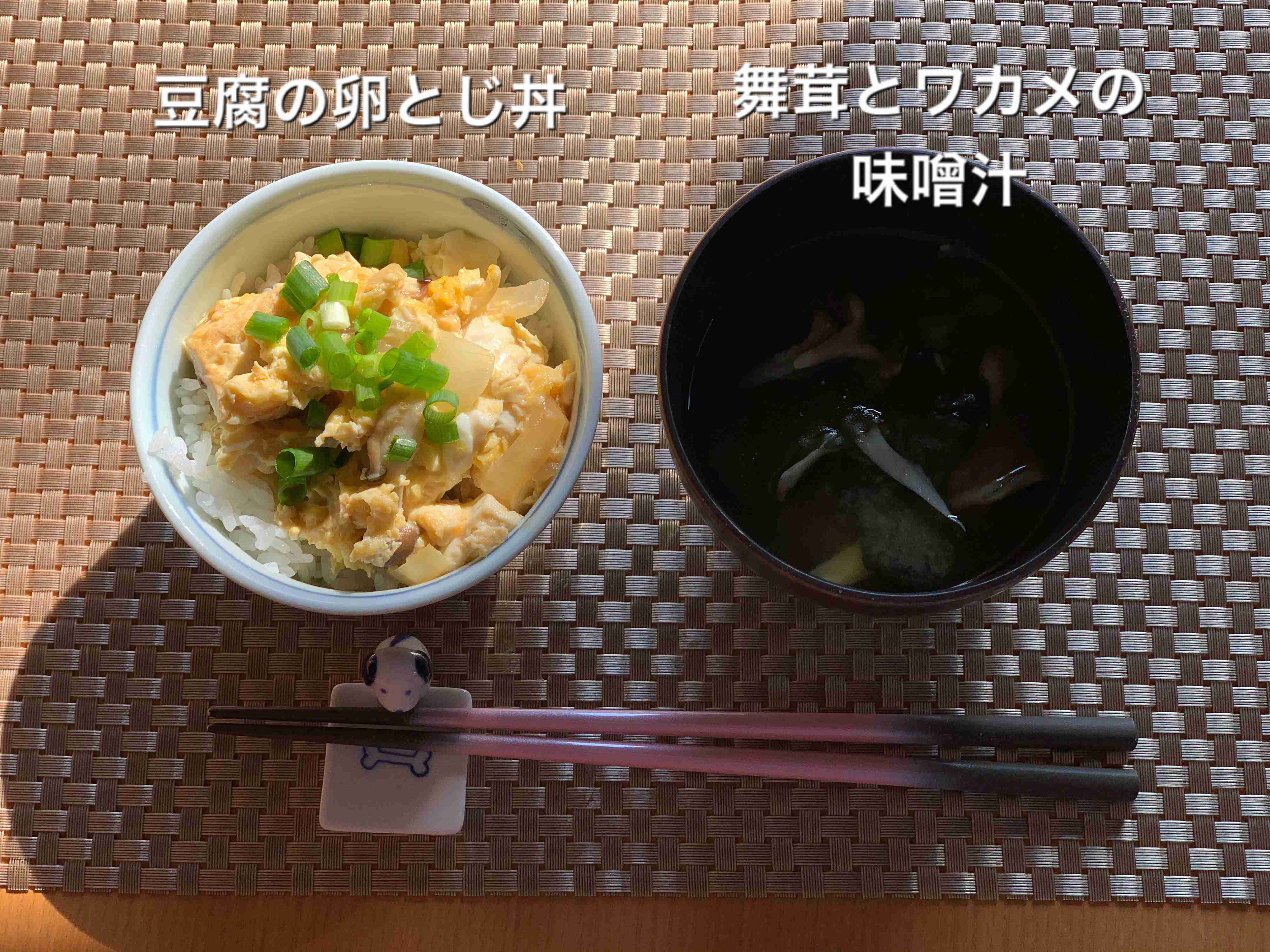 【豆腐の卵とじ丼、舞茸とワカメの味噌汁】