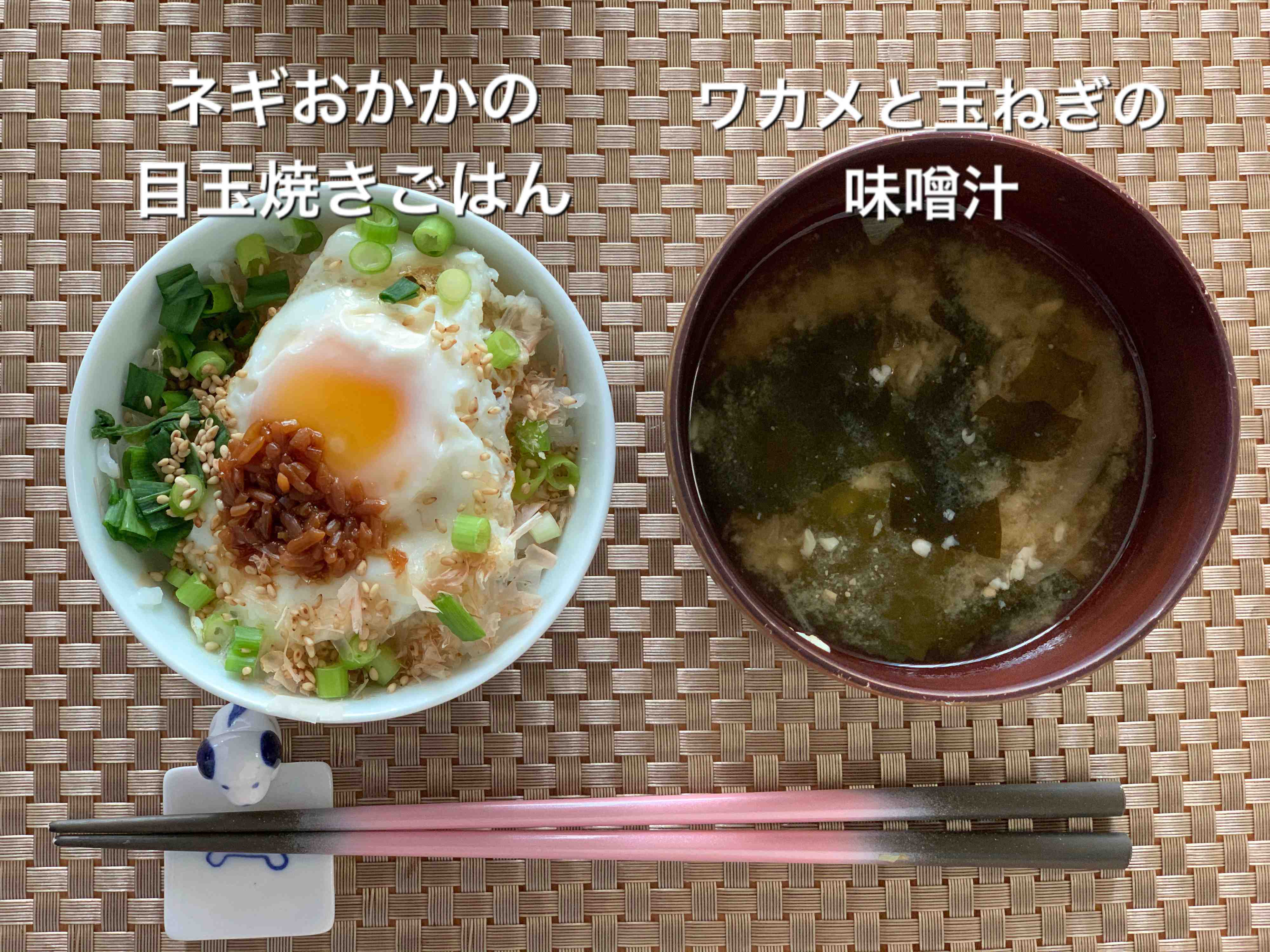 【ネギおかかの目玉焼きごはん、ワカメと玉ねぎの味噌汁】