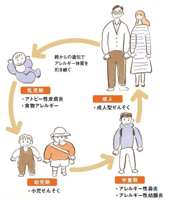 アレルギーマーチとは、異なるタイプのアレルギーを次々と発症することです。乳児期にアトピー性皮膚炎がある場合、成長に伴い食物アレルギーやぜんそく、鼻炎など、ほかのアレルギー疾患を発症する確率が高いことがわかっています。このようにアレルギーの症状が年齢とともに変わっていくこと、またアレルギーを起こす原因が食物からダニ、花粉に変わっていくことを行進になぞらえて、アレルギーマーチと呼びます。年齢が高くなると発症するぜんそくやアレルギー性鼻炎、そしてアレルギー性結膜炎に関係するのがダニ。そのため、子どもが小さいうちからダニ対策を始めることは、アレルギーマーチの予防に効果があると考えられています。