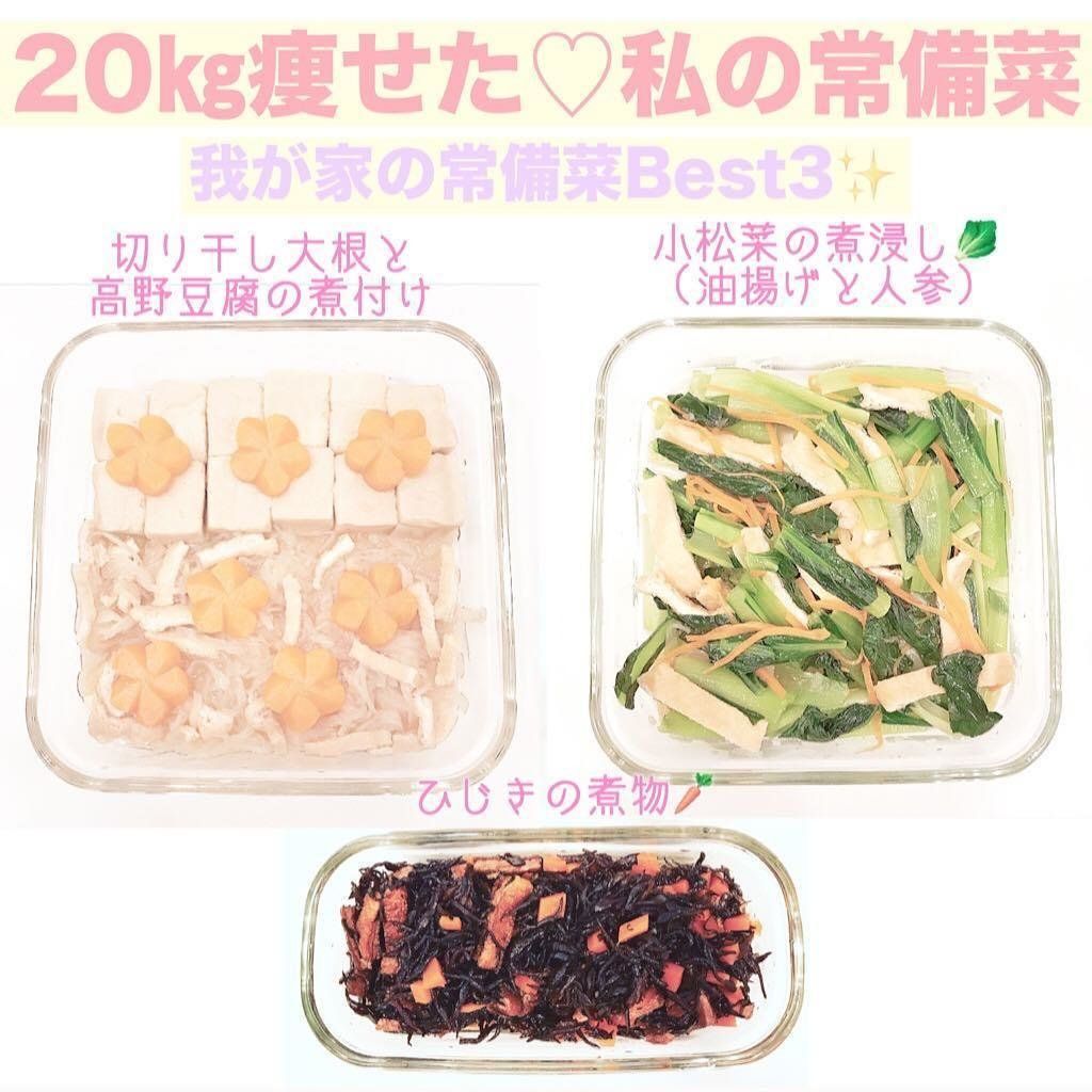 食事は野菜や果物、和食中心で、体に必要な栄養素をしっかりとり、体温をあげるメニューを意識。冷蔵庫に常備菜を入れておくと、おなかが減ったときにジャンクフードや高カロリーなものを食べてしまうのを防止できるのだとか。とくに重宝している常備菜は、切り干し大根と高野豆腐の煮つけ、小松菜の煮浸し、ひじきの煮物の3つだそうですよ。
