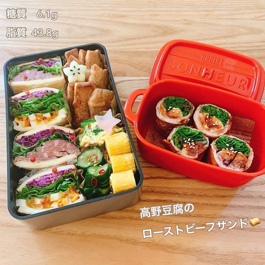 お弁当に高野豆腐でローストビーフのサンドイッチをつくりました。味付けとしてコンソメや中華スープの素で高野豆腐を戻したら、バターで焦げ目がつくまでしっかりと焼きます。卵サラダは、煮卵をクラッシュした甘辛い味に仕上がりました。