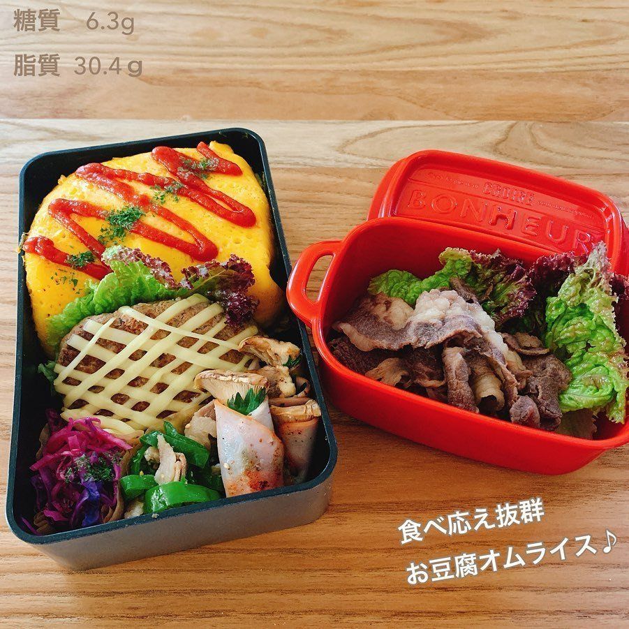 豆腐の水気を切って、粗みじん切りした鶏肉とキャベツを炒めます。豆腐を崩してキツネ色になるまで乾炒りしたら、具材をフライパンに戻しバター、ケチャップ、鶏がらスープの素で味付け。卵液を混ぜて、チキンライスを巻いたらお豆腐オムライスの完成!低糖質にするためにキャベツは芯を使っています。