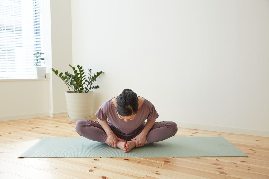 手のひらを合わせる合掌のように、足裏を合わせる合せきのポーズ。股関節や骨盤まわりの筋肉をほぐすことで柔軟性を高め、下半身や内臓の血行をうながします。骨盤まわりが温まるので、生理痛や坐骨神経痛の緩和、冷え症の改善、便秘解消にも◎。リラックス効果も高いので、眠れない夜におすすめです。