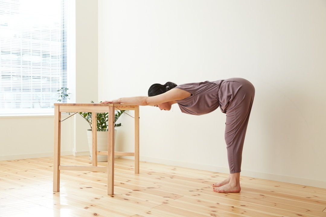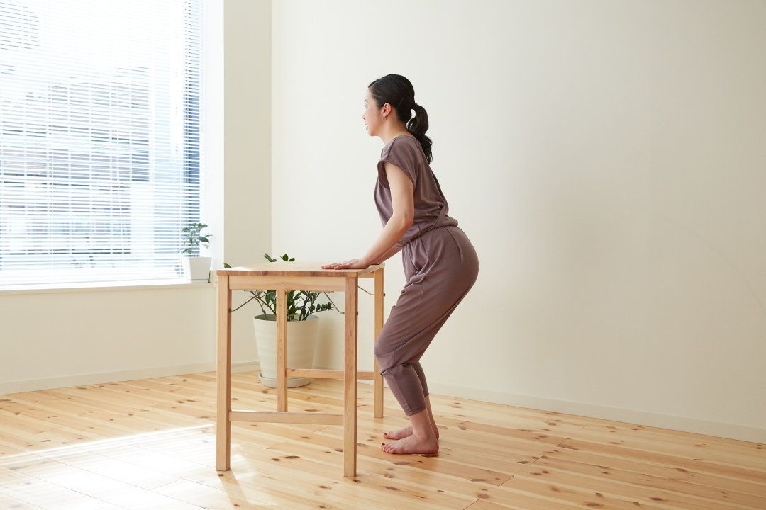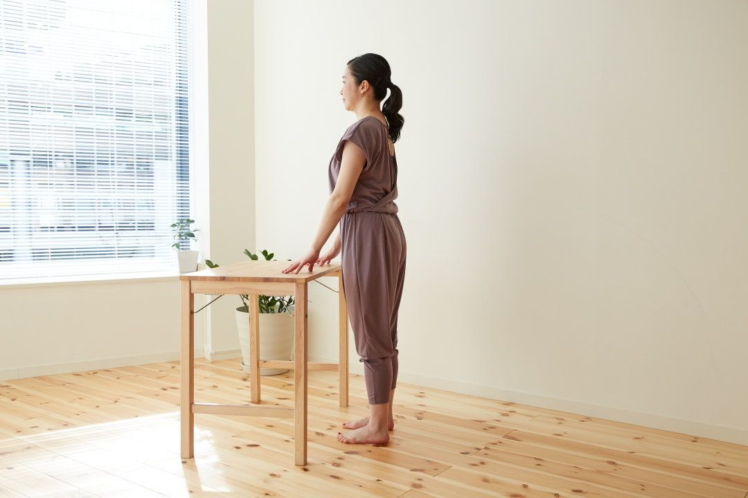 【1】テーブルに向かって、両足を腰幅に開いて立つ。両手を肩幅に広げてテーブルにおく。
